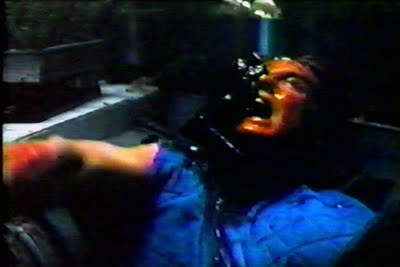 Heading back inside (and thus filling the movies meager running time with lots of corridor shots) Colby and co. are just about to explain what's happened when Hauser reappears, all melty faced and dripping shit for every orifice.