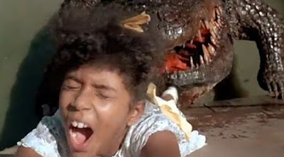 Within seconds of entering the water tho' our small-hipped heroine is attacked by the so called 'killer' crocodile and dragged off to her death.