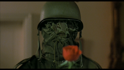 Gazing at his handiwork the crazed killer gently pops a long-stemmed red rose in the dead woman's hand.