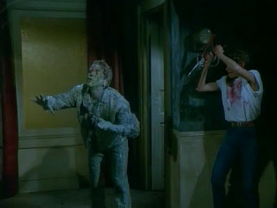 It doesn't come as too much of a surprise when the message turns out to be some scary premonition from the future, a future where poor old Jim is downed by a ghostly fan blade, Mark is menaced by a horny looking Doberman and an already shot to fuck Tina is chased by an axe wielding Valkos.