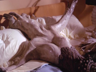 Next up is the sorry tale of groovy antique store owner Timothy Poshman (Mr Sloane himself and star of the fantastic Le Orme McEnery) - alongside his girlfriend Ann (Kendall from Torso and Bird With A Crystal Plumage) - is busy sorting thru' the boxes of tat left to him by his old Aunt Sally in her will which alongside the usual cabinets, cups and crappy knitted toilet roll holders also includes a poppy-eyed portrait of a distant relative called Uncle Albert (Forsyth who, according to IMDB has been in more dodgy stuff than your dad) as well as his beloved penny farthing bicycle.
