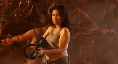 Just when it looks like they may just pack up and call it a night (which had me worried cos it means I'd have to pick another movie to watch and I've only got Black Sun- The Nanking Massacre, a compilation of Doctor Who fan films and Bloody Beast within reach at this point), the stripper points out that she's found the location of the missing members of the scientific crew. It seems that each one has a special tattoo that works a bit like a car alarm or something which means that the mission is back on (much to Ludman's delight).