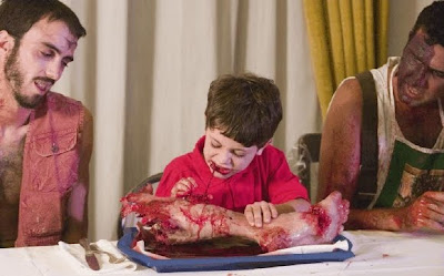 But alas, we'll never know as the creepy couple are thankfully interrupted when, in one of modern cinemas finest 'Laugh Now' moments Antonio's rat-toothed, bowl headed and jam covered seven year old son enters the room asking for a pair of fresh beef curtains to munch on.