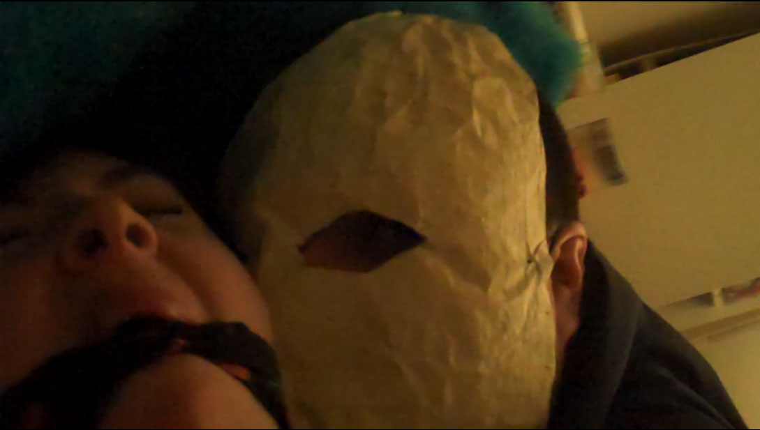 Hiding behind the coat-stand Peter continues to film his intended victims.